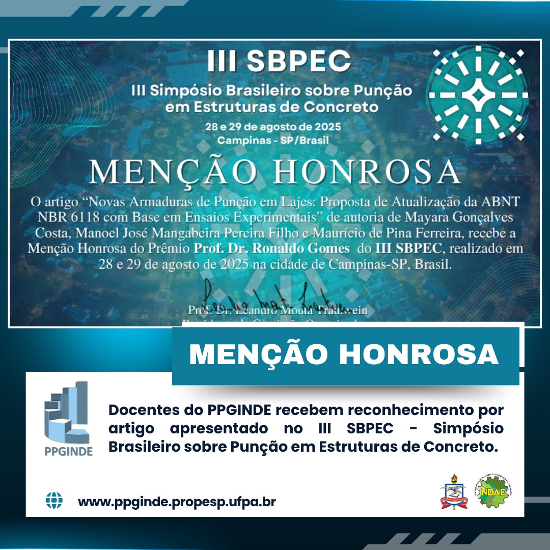 A engenheira Mayara Gonçalves Costa e os professores, vinculados ao PPGINDE, Manoel José Mangabeira Pereira Filho e Maurício de Pina Ferreira, receberam Menção Honrosa no III Simpósio Brasileiro sobre Punção em Estruturas de Concreto (SBPEC), realizado nos dias 28 e 29 de agosto de 2025, em Campinas (SP).
